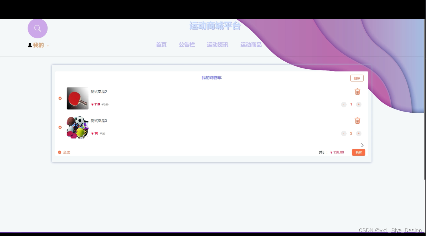 (6)购物车:用户对喜欢的运动产品可以加购,在购物车里面,可以查看到所有加购的商品,支持对商品数量的更改、删除商品,可以进行选择购买。