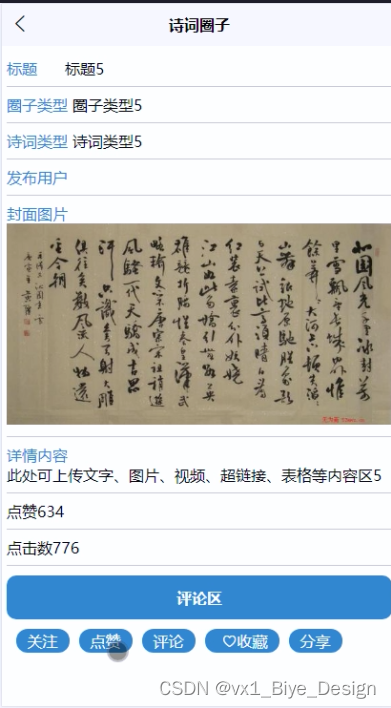 (3)诗词圈子:用户可以查看诗词圈子,在查询到自己想要了解的诗词圈子的时候,可以进入查看详细的介绍,点击“关注粉丝”这一按钮以后会跳转到关注粉丝信息填写的界面,根据提示填写好关注粉丝的信息,点击“提交”以后关注粉丝就完成了,在诗词圈子详情这个界面,同时支持用户对喜欢的诗词进行收藏、点赞、评论、分享的功能。
