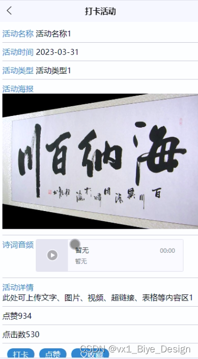 (4)打卡活动:用户可以查看打卡活动,在查询到自己想要了解的打卡活动的时候,可以进入查看详细的介绍,点击“打卡”这一按钮以后会跳转到打卡信息填写的界面,根据提示填写好打卡的信息,点击“提交”以后打卡就完成了,在活动详情这个界面,同时支持用户对喜欢的打卡活动进行收藏、点赞的功能。