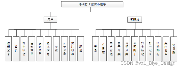诗词打卡微信小程序划分为了普通用户模块和管理员模块这两大部分。