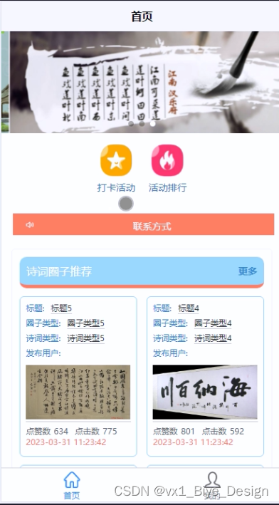 (1)查看诗词打卡微信小程序的首页信息:诗词打卡微信小程序的首页信息包含了首页、打卡活动、活动排行、我的。