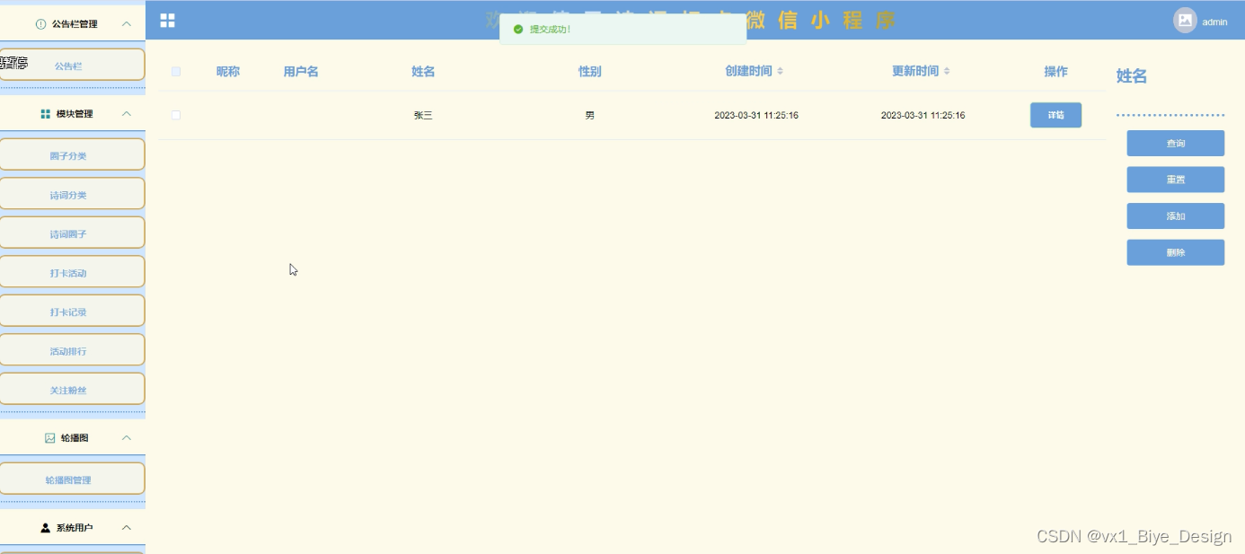 (2)用户管理:管理员可以对诗词打卡微信小程序中的管理员以及前台注册的普通用户进行审核管理。