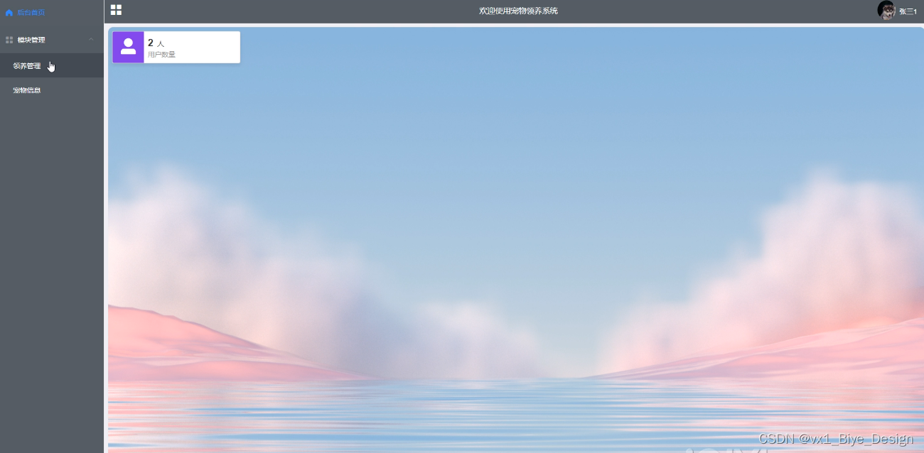 用户进入在系统首页可以查看首页、模块管理(领养管理、宠物信息)、个人中心等内容,如图5-10所示。