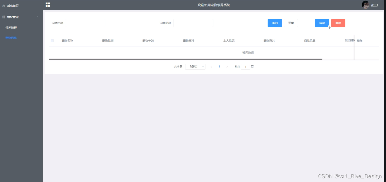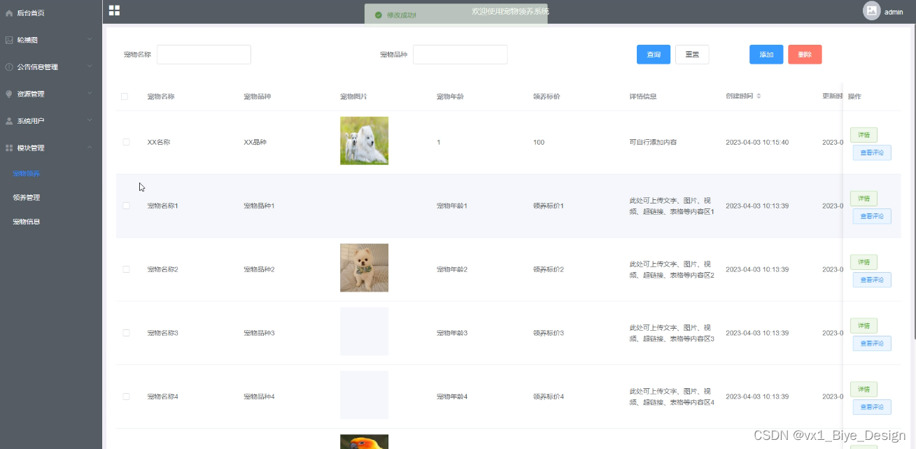 Publishing information online has its outstanding advantages, such as large amount of information, abundant resources, and fast update speed, which is in line with people's requirements for obtaining the most effective and efficient information in a convenient and convenient way. This system is an online pet adoption system that provides a platform for pet enthusiasts to publish information. After users come to the platform, they can publish pet information and apply for adoption, providing great convenience for the majority of users.