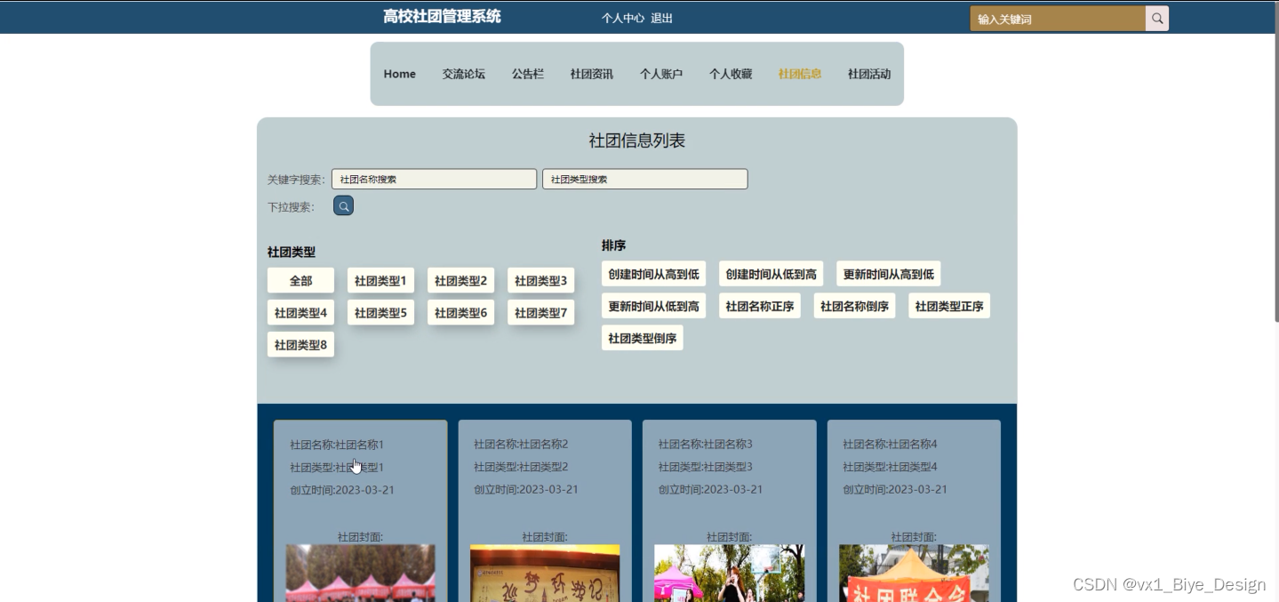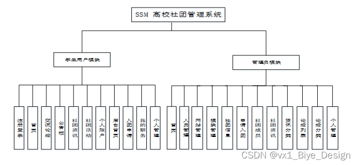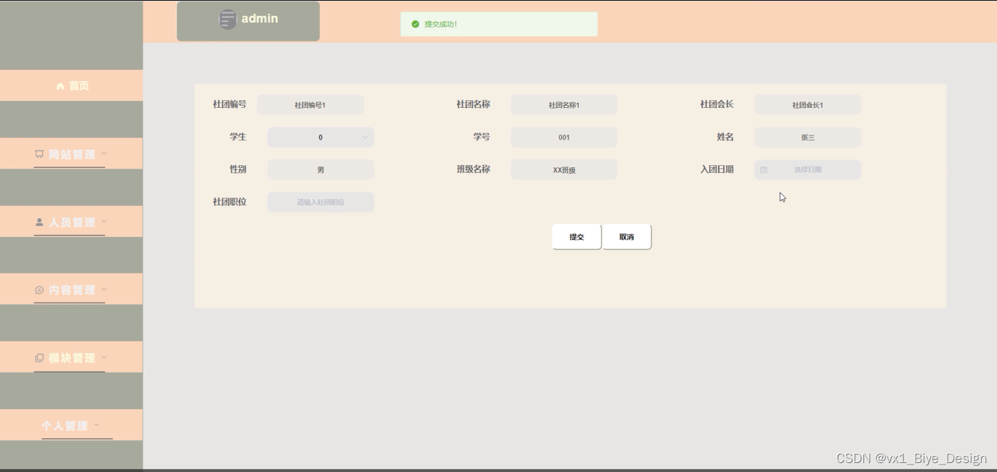 (1)功能要求:可以管理首页,网站管理(轮播图,公告栏),内容管理(论坛列表,论坛分类,社团资讯,资讯分类),人员管理(管理员,学生),模块管理(社团分类、社团信息、入团申请、社团成员、社团活动),个人管理等系统管理功能。