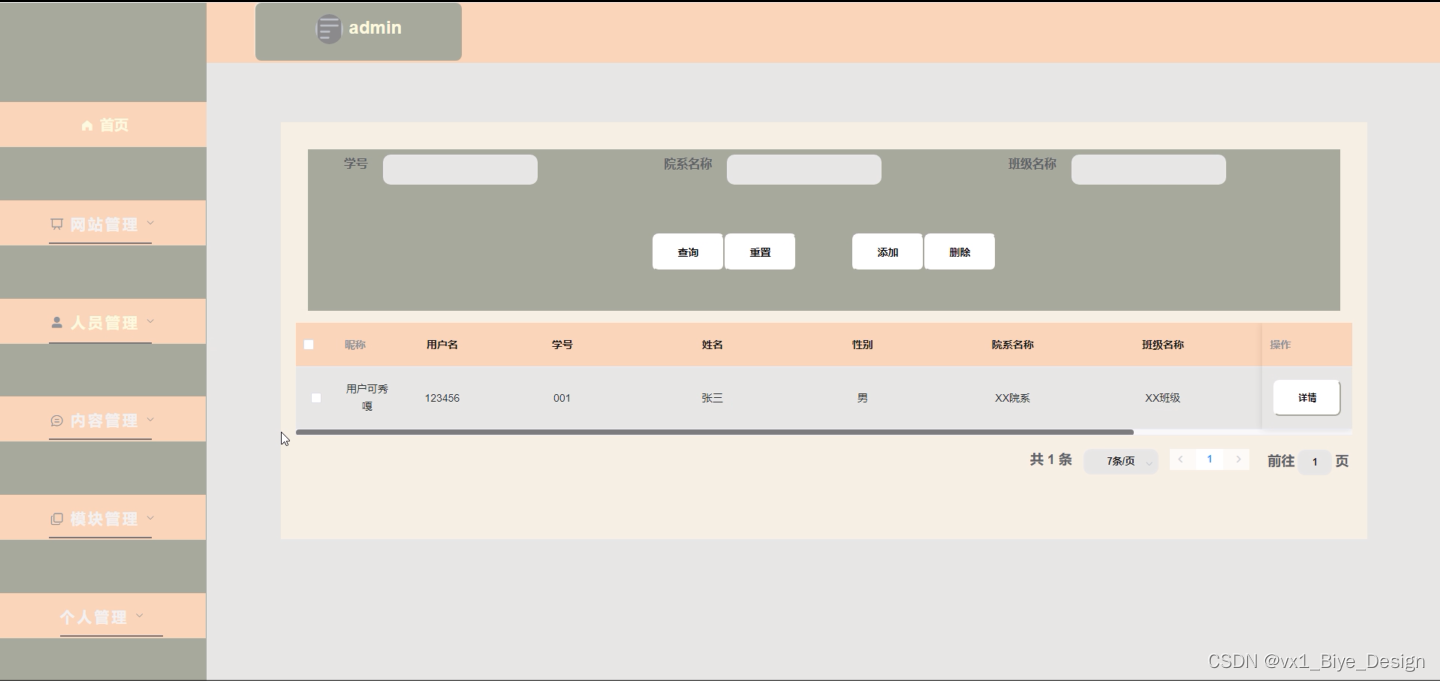 人员管理,在此页面可以查看用户名、昵称、性别、学号等信息,并可根据需要对个人信息进行添加,编辑,删除或查看详细内容等操作,如图5-3所示。