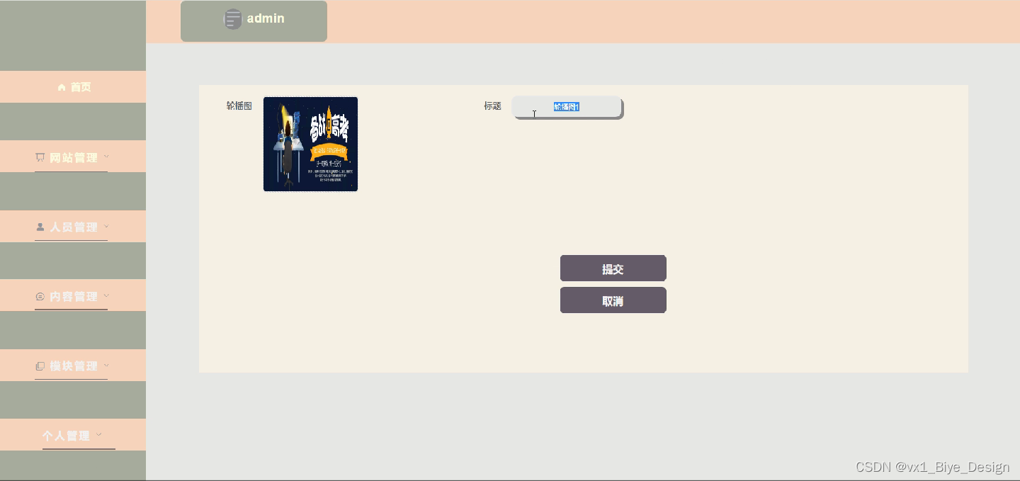 网站管理,在此管理页面可以对轮播图和公告进行查询,重置,添加,删除等操作,如图5-6 5-7所示。