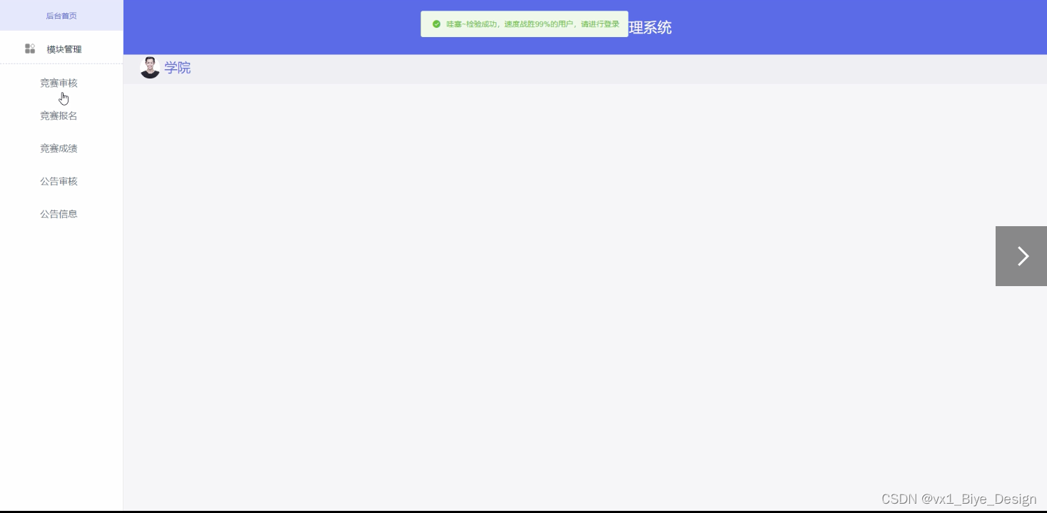 学科竞赛管理系统,在学院首页可以查看首页、竞赛审核、竞赛报名、竞赛成绩、公告审核、公告信息等内容,如图5-1所示。