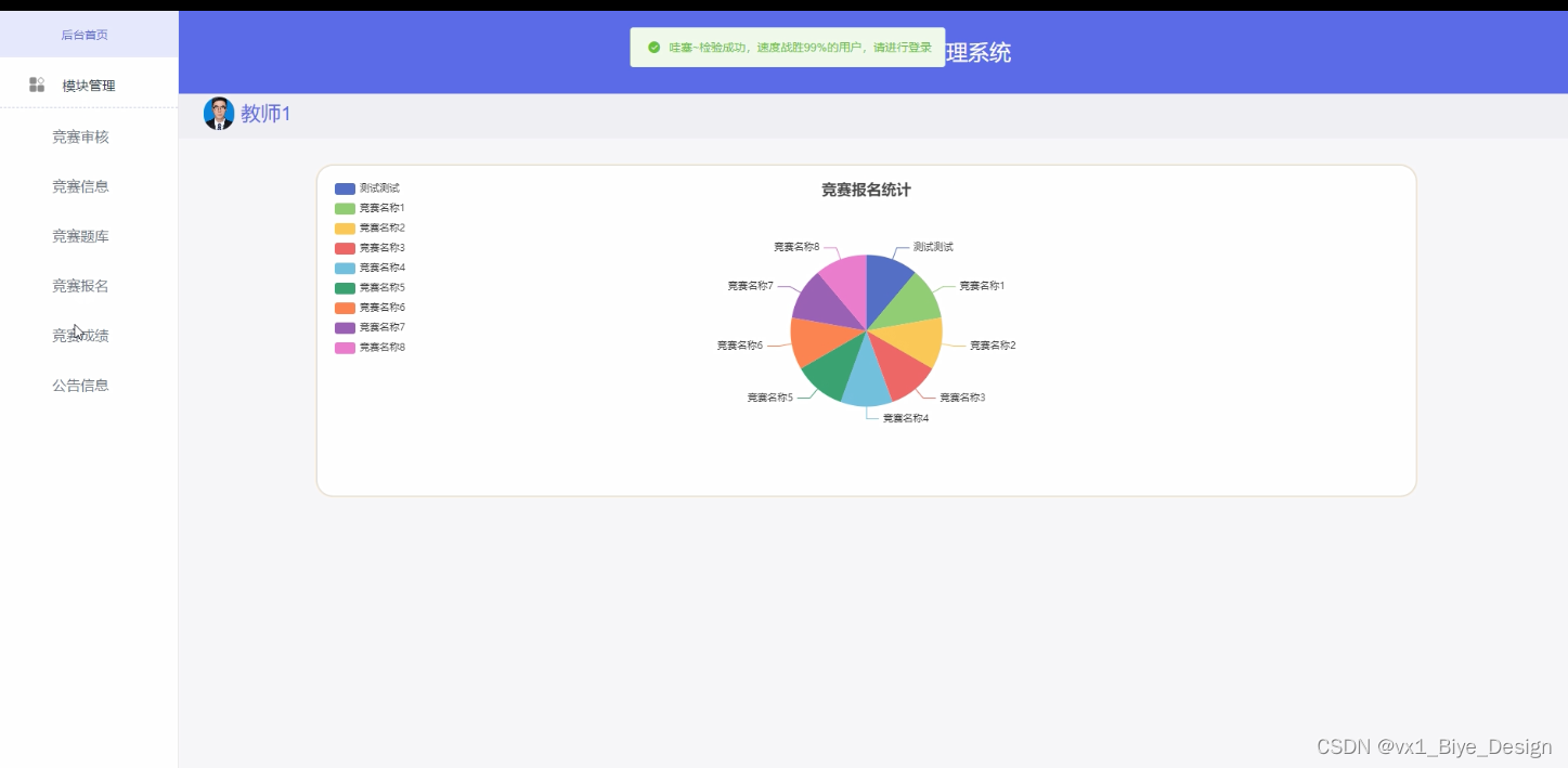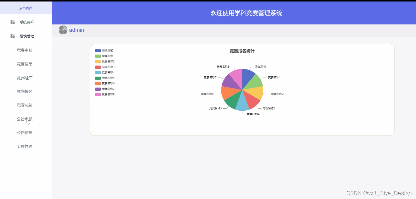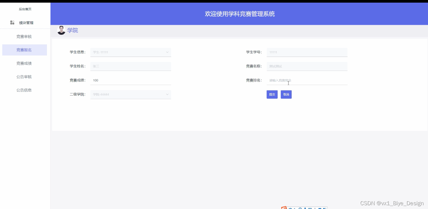 Specifically, in terms of system design, the B/S structure was adopted, and Java technology was also used for design on dynamic pages. MySQL database was used in the backend, making it an excellent subject competition management system.