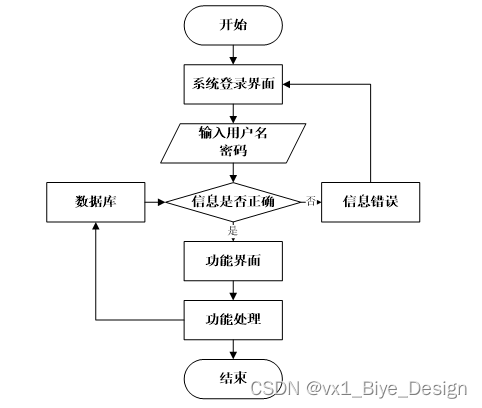 用户打开并进入系统后,会先显示登录界面,输入正确的用户名和密码,系统自动检测信息,若信息无误,则用户会进入系统功能界面,进行操作,否则会提示错误无法登录,操作流程如图3-3所示。