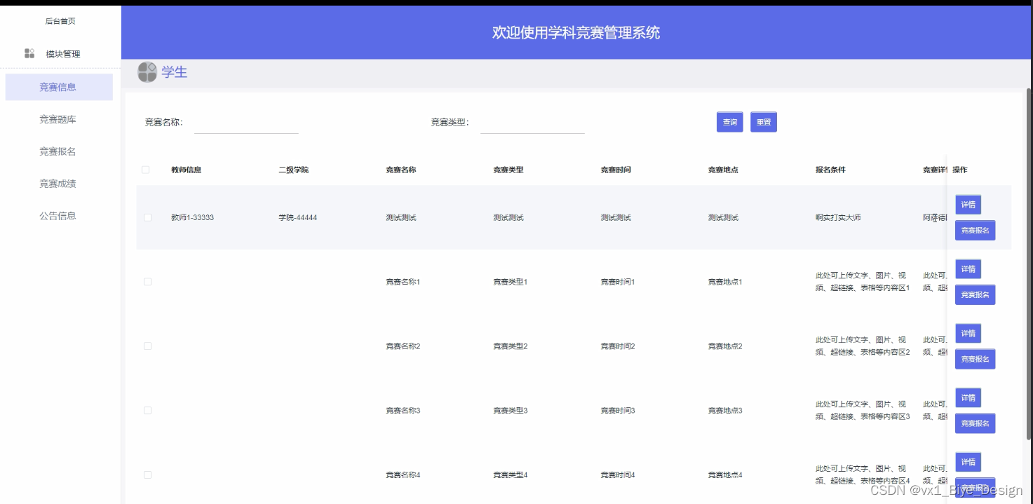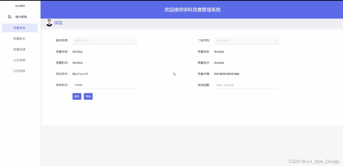 具体在系统设计上,采用了B/S的结构,同时,也使用java技术在动态页面上进行了设计,后台上采用Mysql数据库,是一个非常优秀的学科竞赛管理系统。