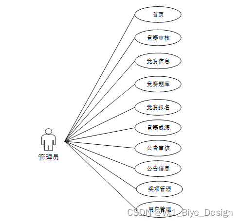 系统中的核心用户是系统管理员,管理员登录后,通过管理员菜单来管理后台系统。主要功能有:首页、系统用户(管理员、学生用户、教师用户、二级学院)模块管理(竞赛审核、竞赛信息、竞赛题库、竞赛报名、竞赛成绩、公告审核、公告信息、奖项管理)等功能。管理员用例如图3-7所示。