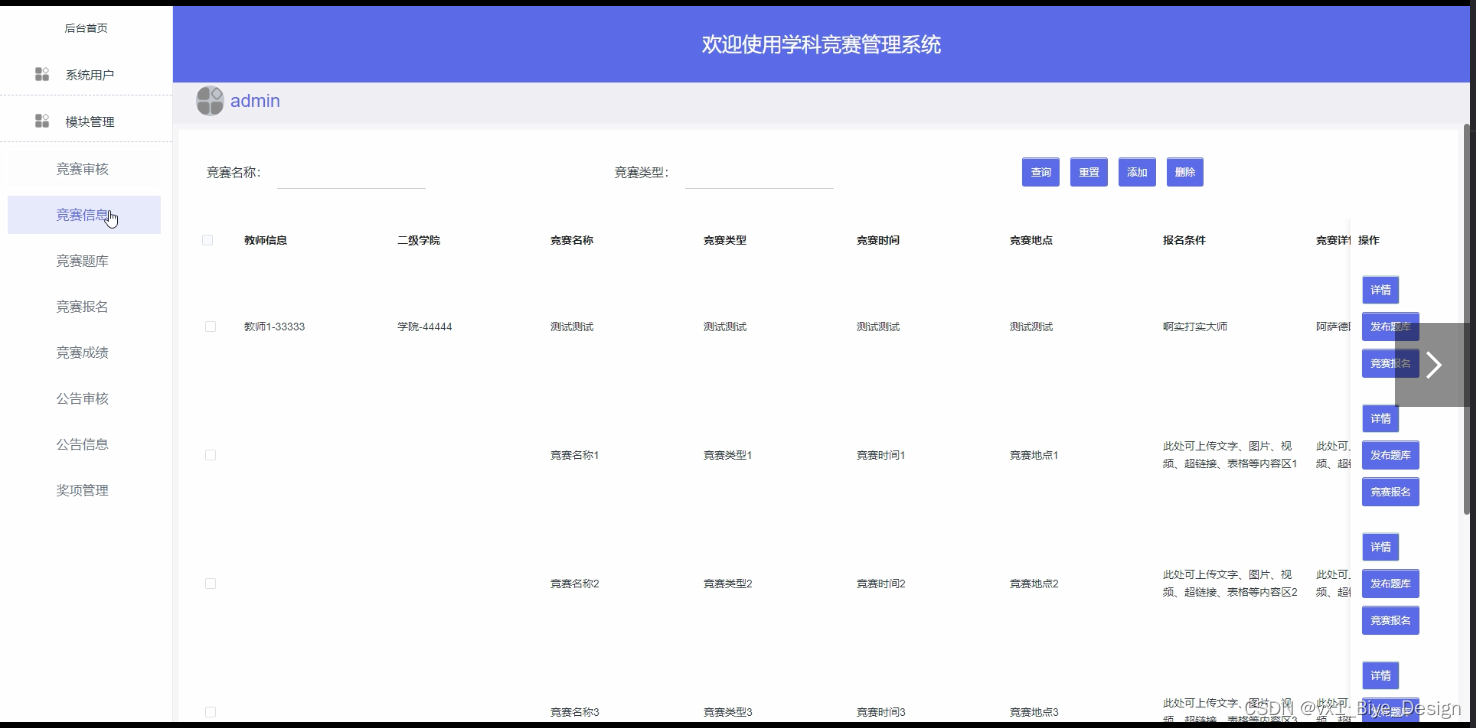 管理员对竞赛信息进行管控,可对竞赛信息进行增删改查、发布题库、竞赛报名等信息操作,如图5-8所示。