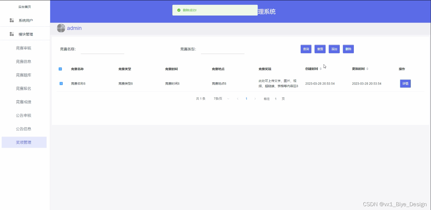 奖项管理,在奖项管理理页面中可以查看竞赛名称、竞赛类型、竞赛时间、竞赛地点、竞赛奖项等信息,并可根据需要进行修改或删除等操作,如图5-9所示。