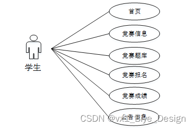 学生进入系统可以进行首页、竞赛信息、竞赛题库、竞赛报名、竞赛成绩、公告信息等。学生用例如图3-8所示。