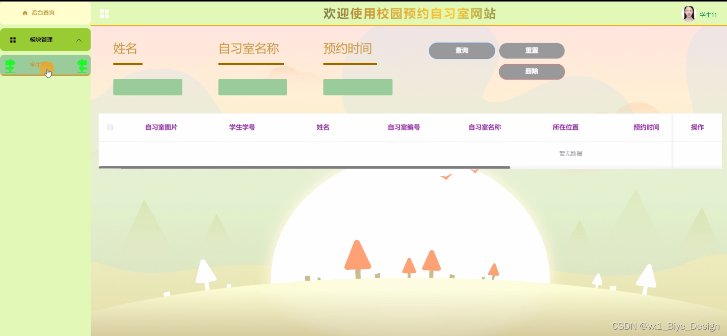 Under the influence of the rapid development of society, the vigorous development of education has greatly increased the number, diversity, quality and other requirements of schools, making the management and operation of education more difficult than in the past. Based on this reality, designing a fast and convenient campus reservation study room website is a very important and valuable thing. For traditional campus reservation and study room websites, campus reservation and study room websites have many incomparable advantages. First, they can quickly update campus information, second, manage a large amount of information, and finally, they are highly secure and easy to use. This makes the management and operation of campus reservation and study room websites very convenient. In the 21st century, due to the rapid development of technology and economy, people's general spiritual needs for non material aspects have become increasingly diverse. This system is proposed to achieve these goals.