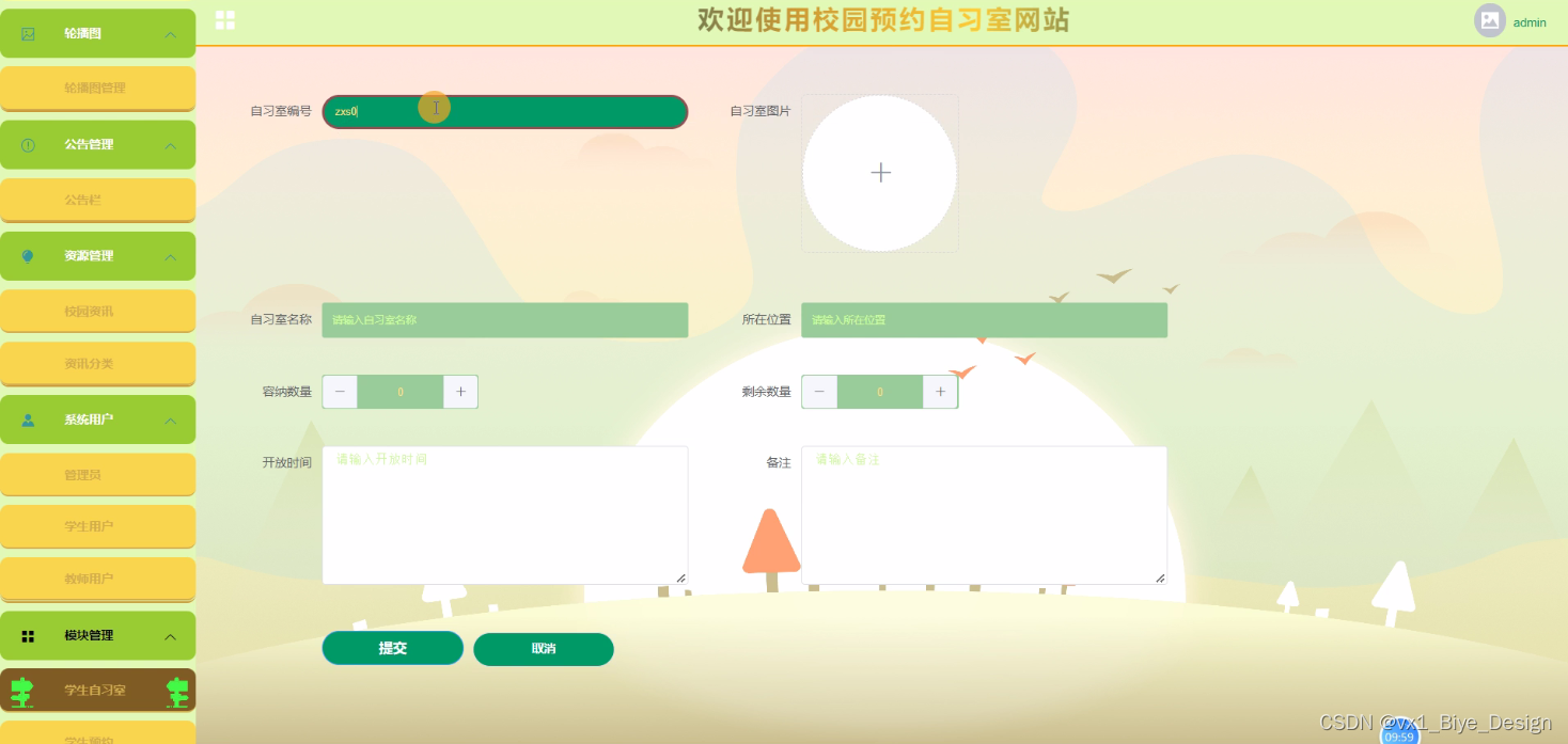2. 系统功能还不够完善,无法提供丰富多彩的在线功能,只能实现管理员:首页、轮播图、公告栏、资询管理(校园资讯、资讯分类)系统管理(管理员、学生用户、教师用户)模块管理(学生自习室、学生预约、教师自习室、教师预约)系统管理等一系列功能。