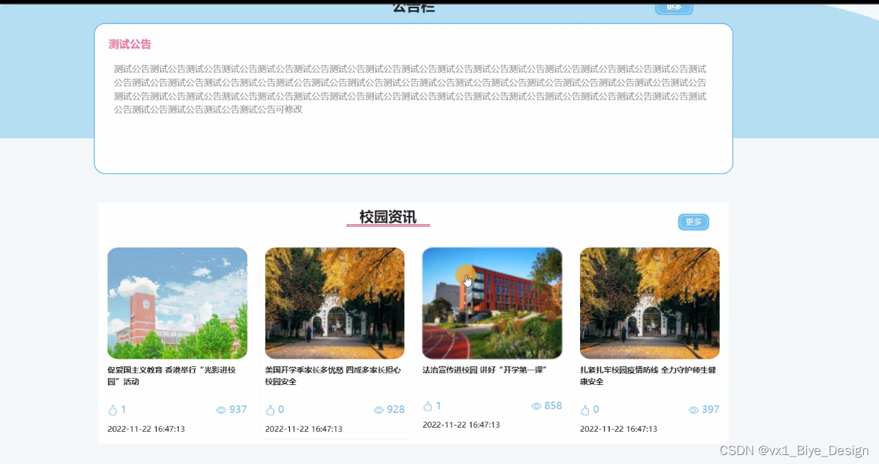 校园资讯,在校园资讯页面可以查看资讯内容、资讯图片、等详情并可根据需要进行点赞、收藏,如图4-4所示。