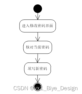 用户功能界面可对自己的密码进行修改。进入修改密码界面后核对当前密码,核对成功后填写新密码。修改密码活动图如下图所示。