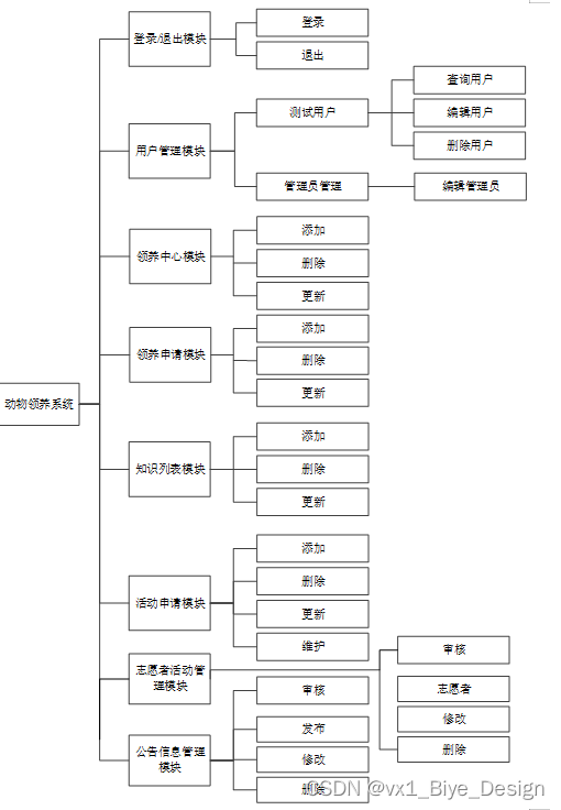 动物领养系统主要是为了更加地完善动物领养的服务情况,对用户的信息、领养中心、领养申请、志愿者活动、活动申请等提供了方便的机制。本系统有多类使用者,分别是管理员和用户注册。以下是从这两种用户的角度分别介绍本系统所要实现的功能。