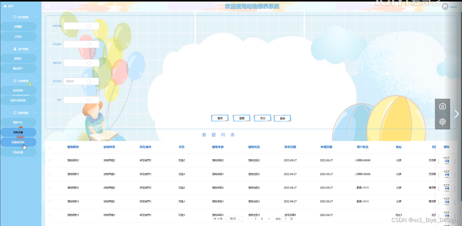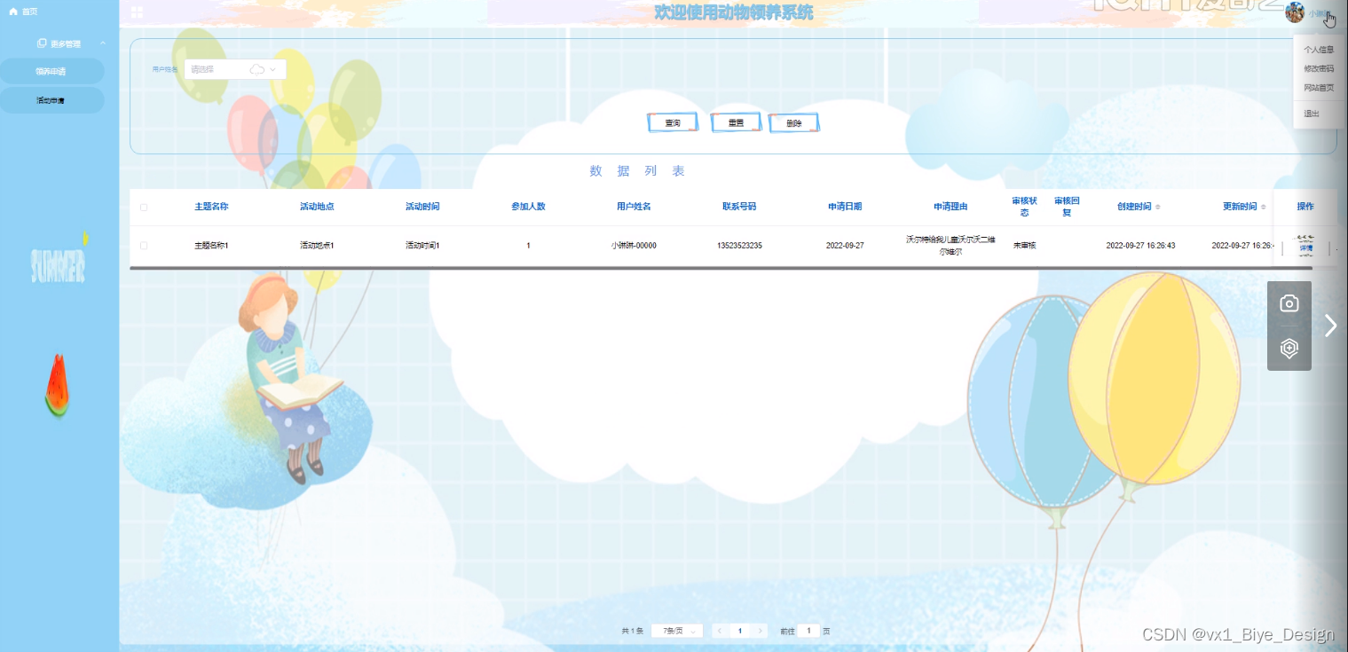 活动申请:用户登录动物领养系统首页时,可以选择自己想要的活动进行申请等。