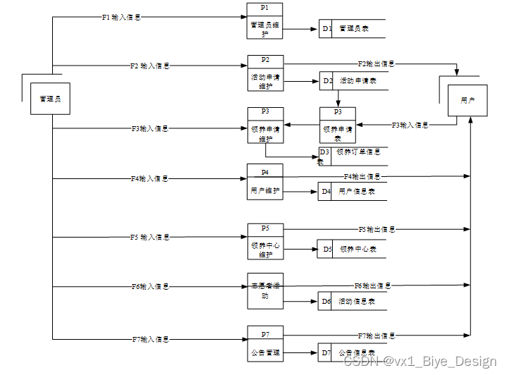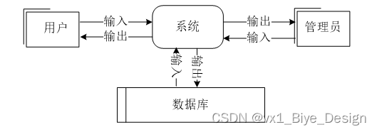 如下为系统的顶层数据流图,外部实体有用户和管理员,分别对系统输入数据,从而得到要输出的数据。