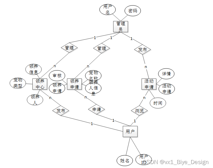 本系统根据第三范式的思想设计数据库,减少最大程度的冗余,总共建立有多个表,用户注册表、管理员表、宠物知识、领养中心、志愿者活动、领养申请、活动申请等。