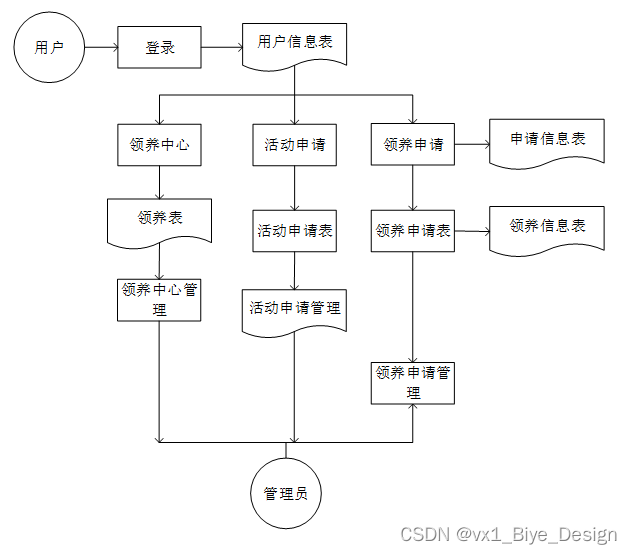 动物领养系统底层数据流图主要描述系统底层模块的数据流、数据载体、数据处理、外部实体的具体交互。本系统就是管理员和普通用户在用户管理、领养申请、活动申请、志愿者活动管理等模块上的数据交互。