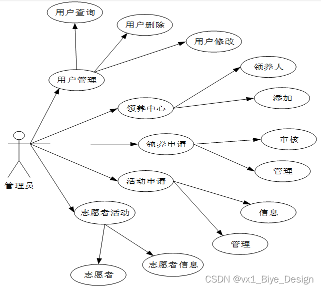 2.管理员主要负责用户管理、领养中心管理、领养申请管理、志愿者活动管理、活动申请管理,下图所示描述管理员的用例图。