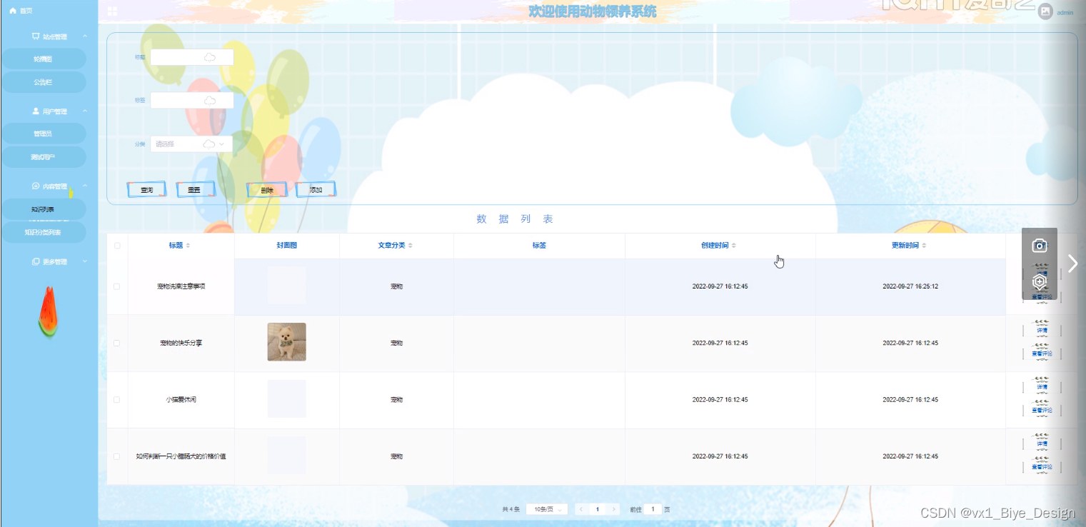 用户管理:对用户进行管理,用户的注册,包括用户昵称、用户名、用户的动物信息(动物类别、动物性别、年龄等)用户的账号信息: