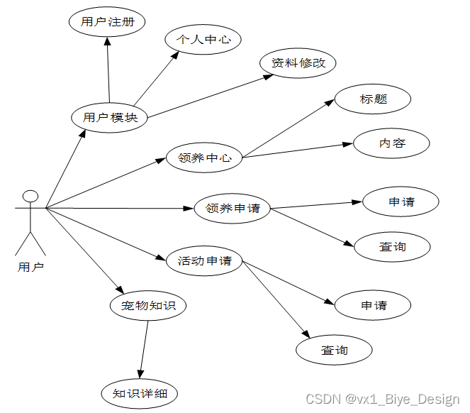用户登录后,进入功能页面,进行宠物知识、领养中心、志愿者活动、领养申请、活动申请。用户使用功能活动图如下图所示。
