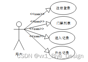 系统设计的目的是分析系统包括的所有功能结构,为开发人员设计开发和实现系统做好准备工作。经过前期的需求调查、分析和整理之后,确定的总体需求主要包括多个模块,分别是:用户管理、门禁列表管理、进入记录管理、外出记录管理、访客管理、访客进出管理。系统整体角色分为三个部分,一是用户、二是访客、最后是管理员。