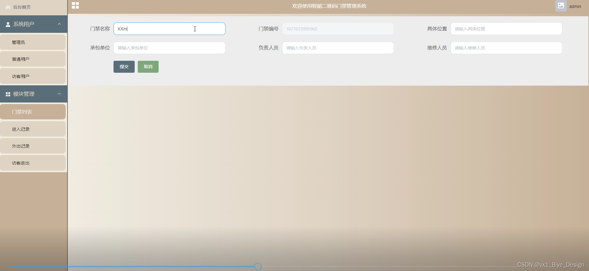门禁列表,同时查看门禁列表信息,包括门禁名称、门禁编号、具体位置、承包单位、负责人员等。