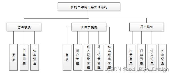 智能二维码门禁管理系统在对需求做解析后,整个系统主要分为三个部分:管理人员、用户和访客,每个模块下的分支功能不一样。对功能做出如下说明: