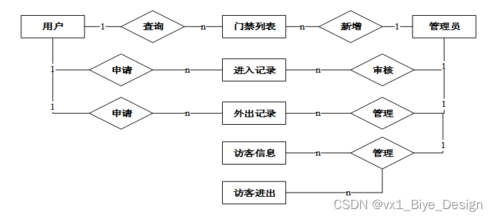 对于一个要开发的系统来说,E-R图可以让别人能更快更轻松的了解此系统的事务及它们之间的关系。根据系统分析阶段所得出的结论确定了在智能二维码门禁管理系统中存在着多个实体分别是用户、管理人员、进入记录、外出记录、访客进出、门禁列表。