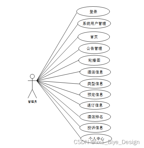 web后台管理上的管理员是维护整个酒店住宿预定系统中所有数据信息的。管理员角色用例如图2-4所示。
