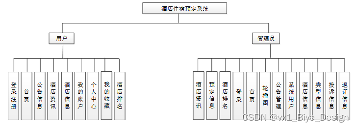 按照酒店住宿预定系统的角色,我划分为了系统用户管理模块和管理员管理模块这两大部分。
