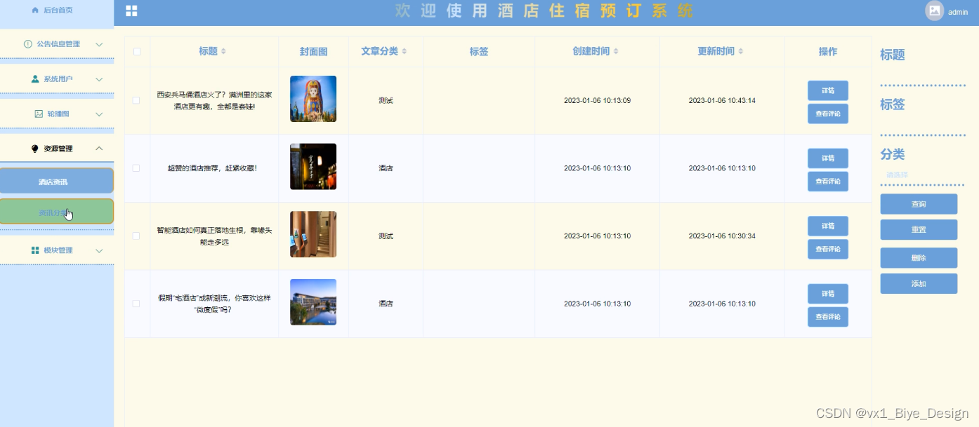 (4)资源模块管理:当点击“资源管理”这一菜单的时候,会出现酒店资讯+资讯分类这两个子菜单,能够对用户在前台提交的酒店资讯进行管理,同时对前台展示的酒店资讯信息进行增删改查操作;