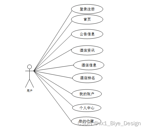 通过2.3功能的分析,得出了本酒店住宿预定系统的用例图: