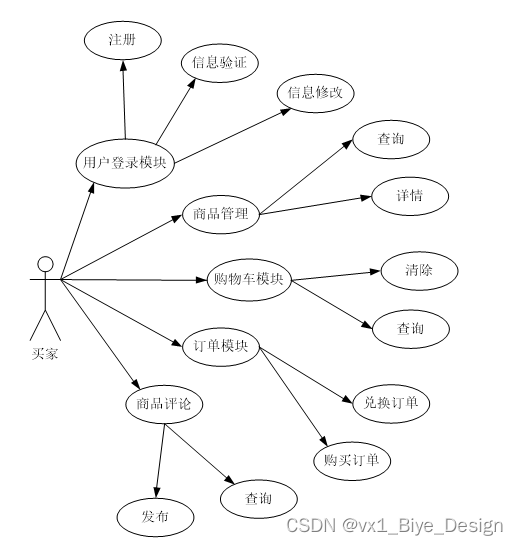 2.买家用户主要使用系统的在线购买业务,下图所示为买家用户用例图。