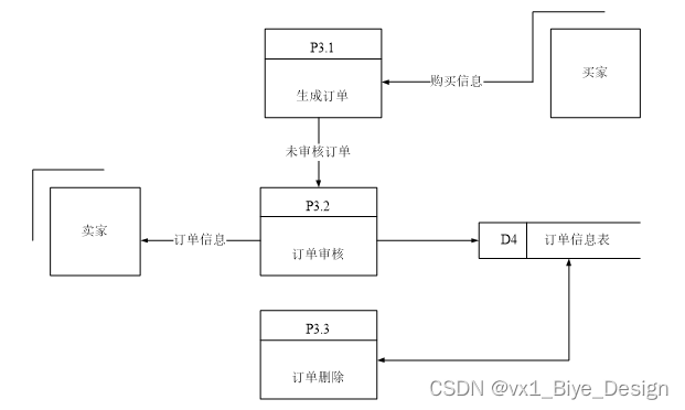 将订单信息管理进行细化得到订单信息管理二层数据流程图,如下图所示。