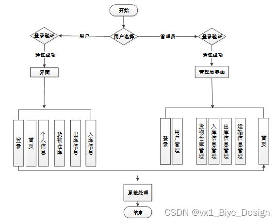 本系统主要包含了、登录模块的实现、用户管理模块、货物仓库模块、入库信息模块、出库信息模块、运输信息模块等多个功能模块。下面分别简单阐述一下这几个功能模块需求。不同的权限对应相应的功能模块的需求,管理员权限的级别是最高的,所以所对应的需求是最多的,根据不同的权限分别简单阐述一下各个权限的需求。