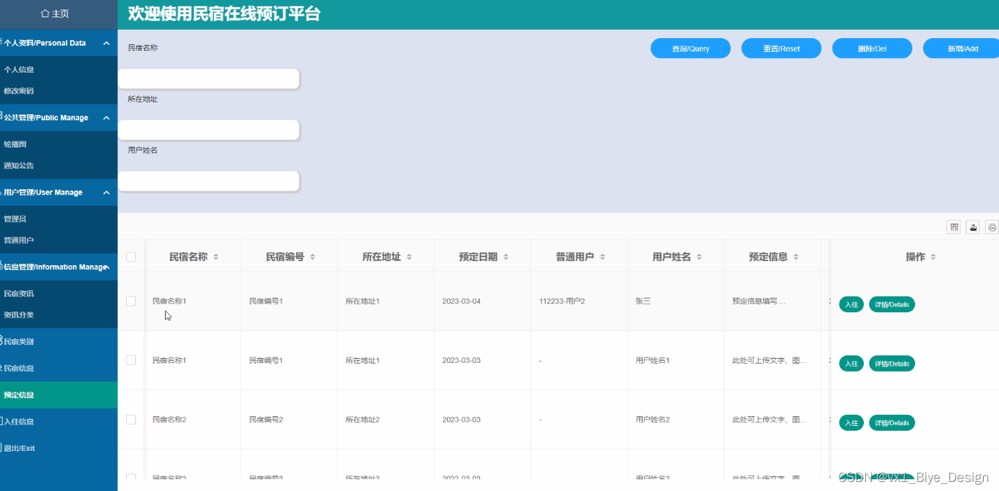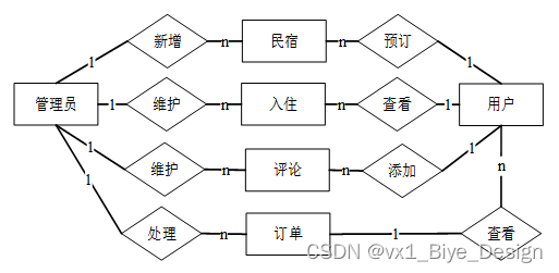 民宿管理模块:民宿管理分为民宿添加、修改和民宿预订。民宿信息由管理员进行修改、添加、删除操作;民宿预订由普通用户来执行。