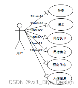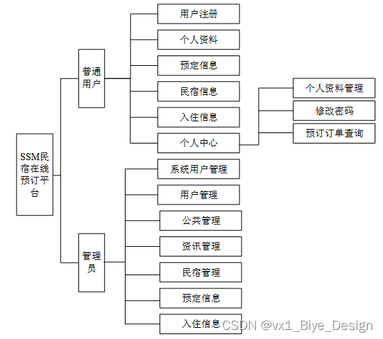 民宿在线预订平台的功能主要分为前台用户根据自己的需求进行注册登录,浏览民宿信息并对需要的民宿进行预订操作,管理员主要对首页、个人资料、公共信息(轮播图、通知公告)用户管理(管理员、普通用户)信息管理(民宿资讯、资讯分类)民宿类别、民宿信息、预定信息、入住信息进行处理。