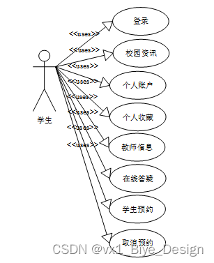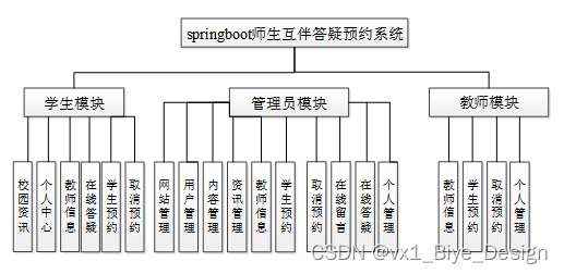 师生互伴答疑预约系统在对需求做解析后,整个系统主要分为两个部分:管理员和学生,每个模块下的分支功能不一样。对功能做出如下说明: