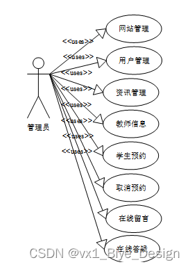 系统设计的目的是分析系统包括的所有功能结构,为开发人员设计开发和实现系统做好准备工作。经过前期的需求调查、分析和整理之后,确定的总体需求主要包括多个模块,分别是:留言管理、学生管理、教师管理、精选学生预约。系统整体角色分为三个部分,一是教师、二是学生、最后是管理员。权限分布也是很明显,学生是在除去浏览信息之外还具有查询和管理自己账户信息、学生预约、取消预约、在线答疑等权限;管理员是最高权限拥有者。