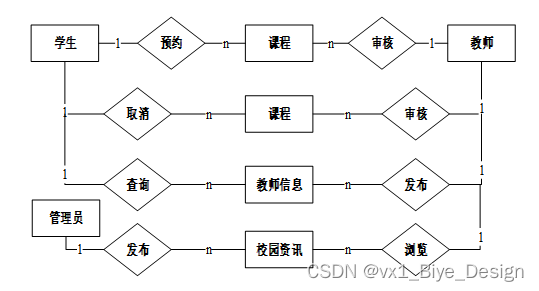 对于一个要开发的系统来说,E-R图可以让别人能更快更轻松的了解此系统的事务及它们之间的关系。根据系统分析阶段所得出的结论确定了在师生互伴答疑预约系统中存在着多个实体分别是用学生、管理员、课程、问题、教师。