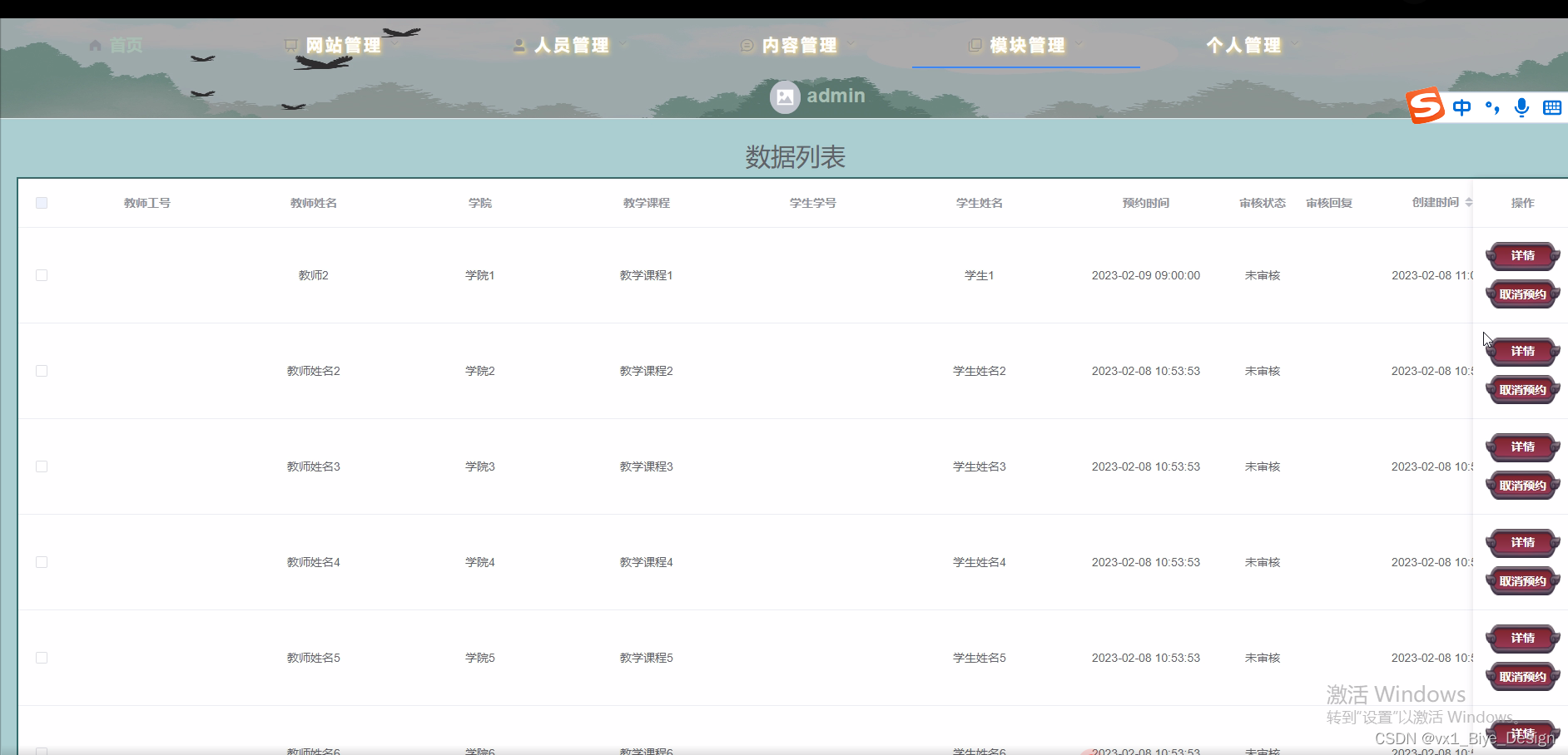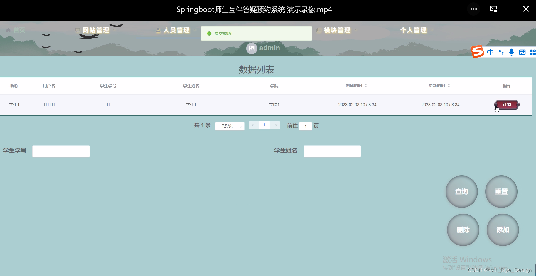 学生登录系统后,可在学生预约模块预约课程,管理员在后台可以查看或搜索预约信息,同时可回复或删除预约信息。