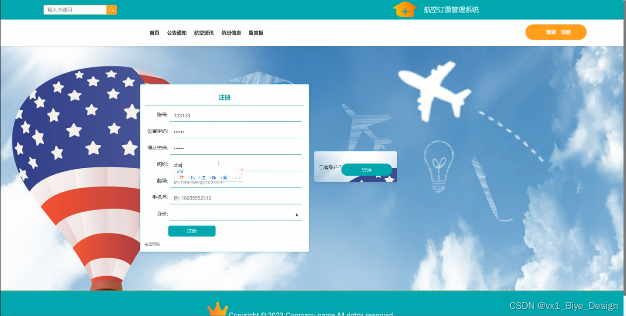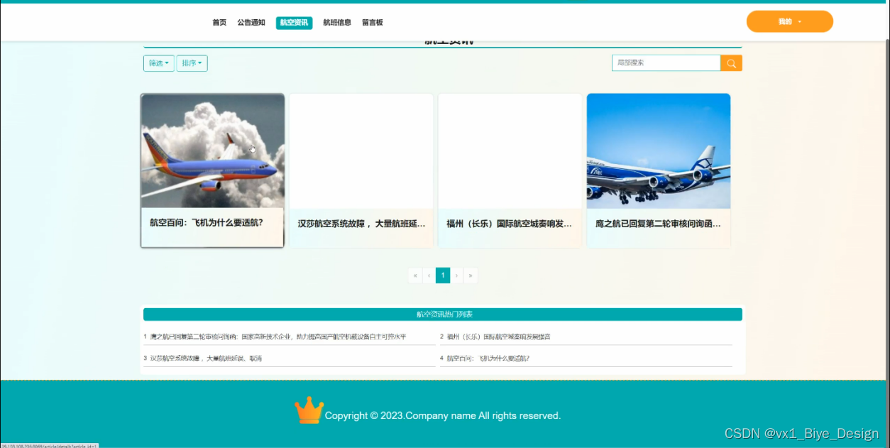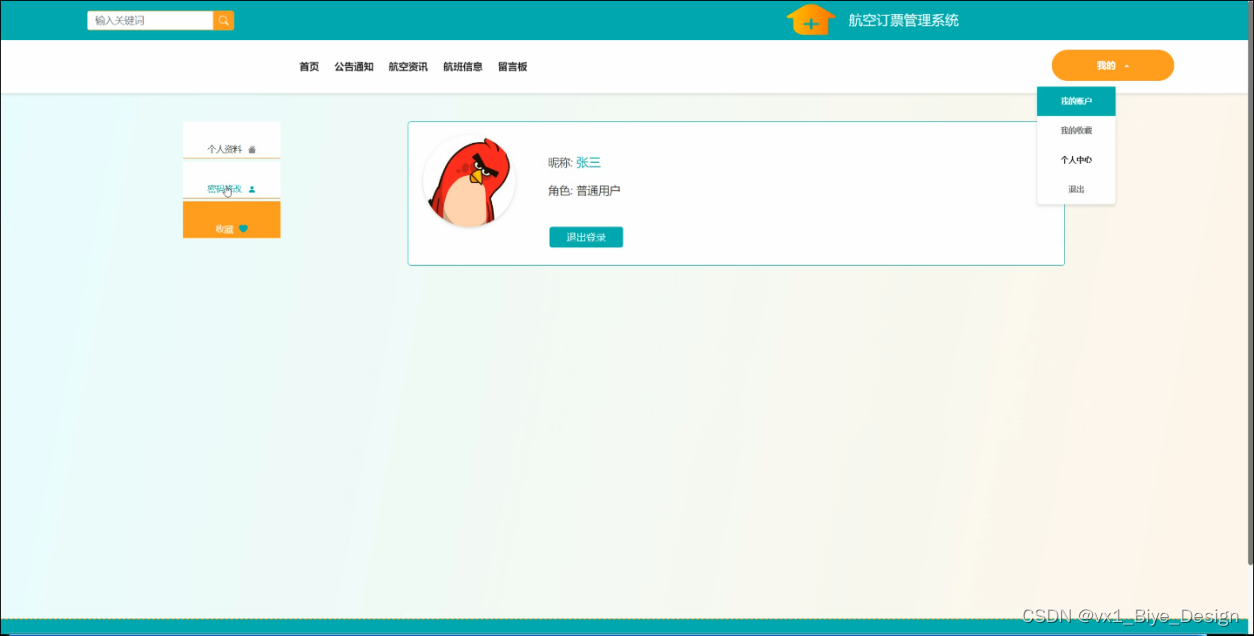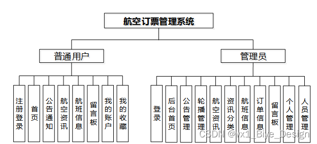 (1)功能要求:首页、人员管理(管理员、普通用户)、网站管理(轮播图、公告通知)、内容管理(航空资讯、资讯分类)、模块管理(航班信息、订单信息、留言板)、个人管理等功能模块。