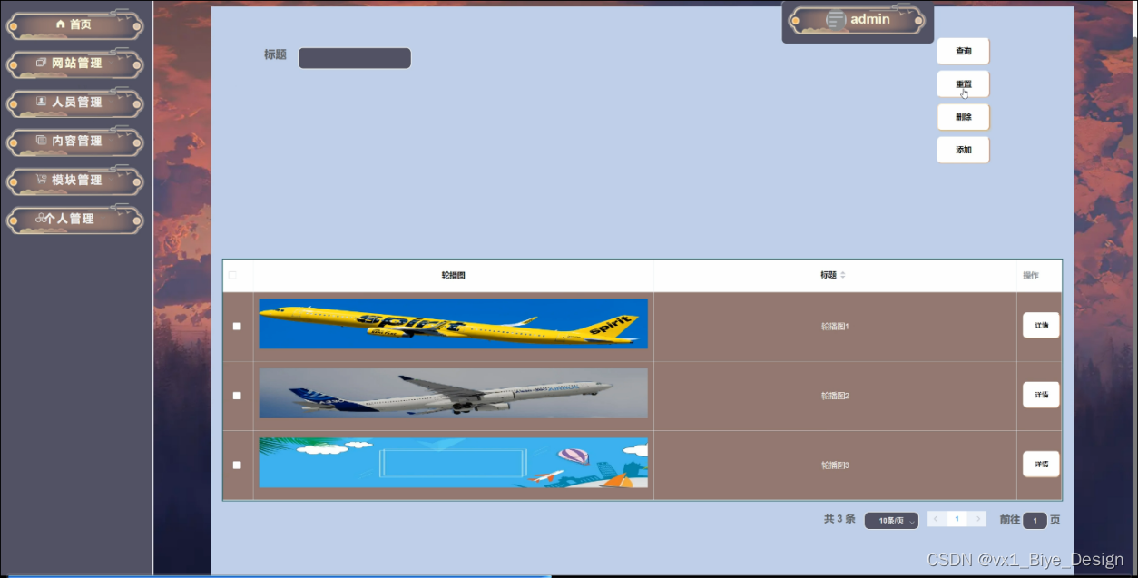 轮播管理,在此界面可对轮播图详细信息,并可根据需要进行查询、重置、添加或删除等详细操作,如图5-5所示。